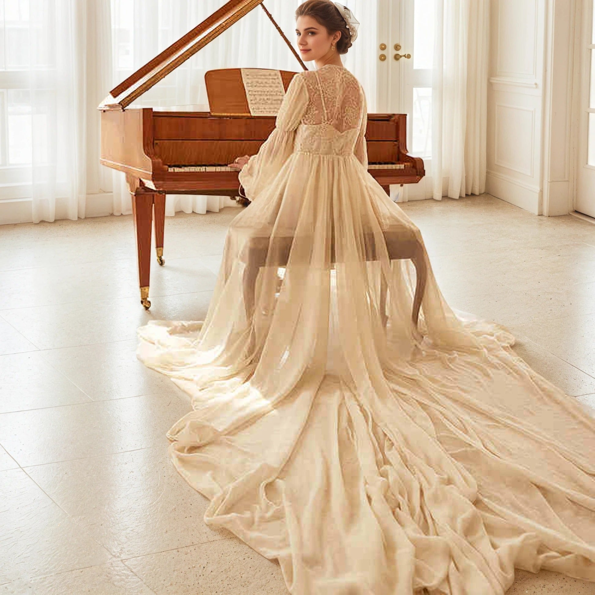 - Design: Long train, open front with tie closure, puffed sleeves