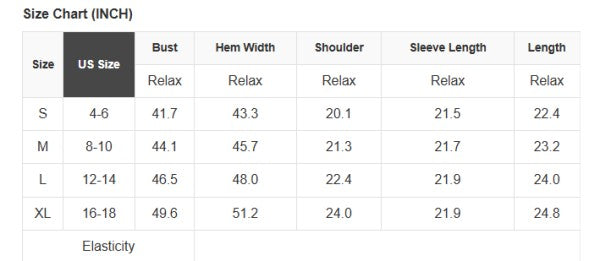 See size chart for approximate measurements.